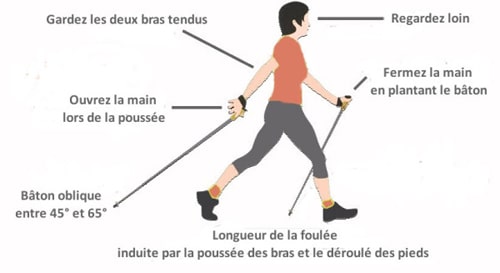 Le principe est simple : il s’agit d’accentuer le mouvement naturel des bras pendant la marche et de propulser le corps vers l’avant à l’aide de deux bâtons qui permettent d’aller plus vite et de marcher plus longtemps. Les mouvements des bras et des jambes doivent être synchronisés et alternés.